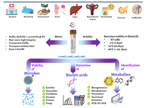 BiomLife® is a specialized transport medium designed to collect and preserve any specimen for extended periods. It preserves the viability of aerobic and anaerobic microbes, including bacteria, viruses, parasites, and fungi, while maintaining the integrity of nucleic acids. BiomLife® is suitable for various analyses, such as metabolite analysis, PCR, RT-PCR, metagenomics, metabolomics, proteomics, functional genomics, and more. It is the optimal choice for researchers, healthcare professionals, and experts who require reliable preservation and transportation of specimens. Our innovative formula guarantees prolonged stability and protection of a broad spectrum of microorganisms, including bacteria, viruses, parasites, and fungi, through transportation, processing, and long-term storage.